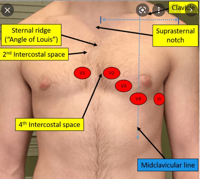 Note: Electrode for lead V4 should be placed underneath the breast tissue in women.  If necessary, the electrode for lead V5 should also be placed underneath breast tissue.