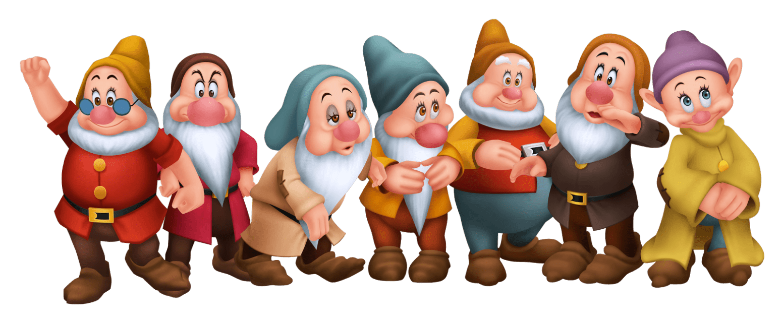 Prof, Grincheux, Simplet, Atchoum, Timide, Dormeur et Joyeux