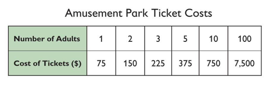 The constant of proportionality is $75. Each adult ticket costs $75.