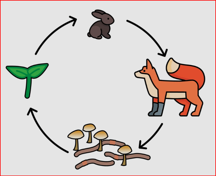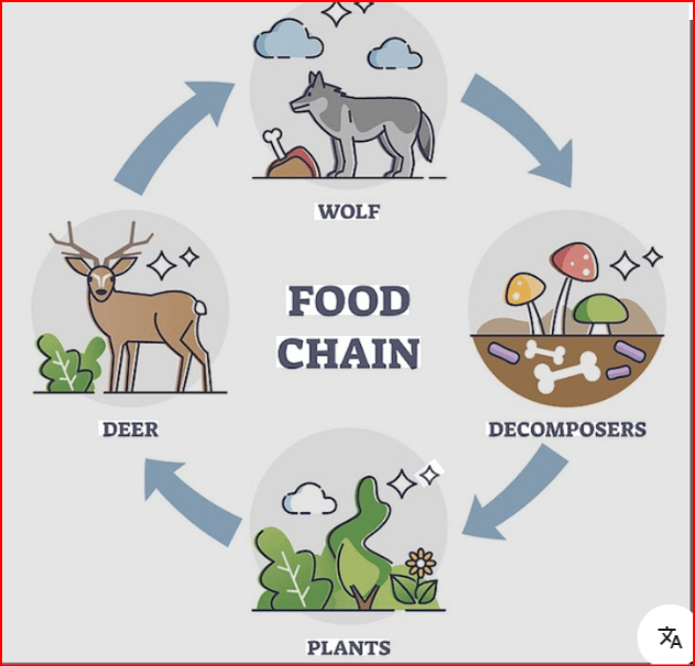 Plants are producers. They make food. Deer is a primary consumer. It eats plants. Wolf is a secondary consumer, it eats the deer and gets the nutrients from the plans. Mashrooms are decomposers. They break dead bodies down into nutrients.