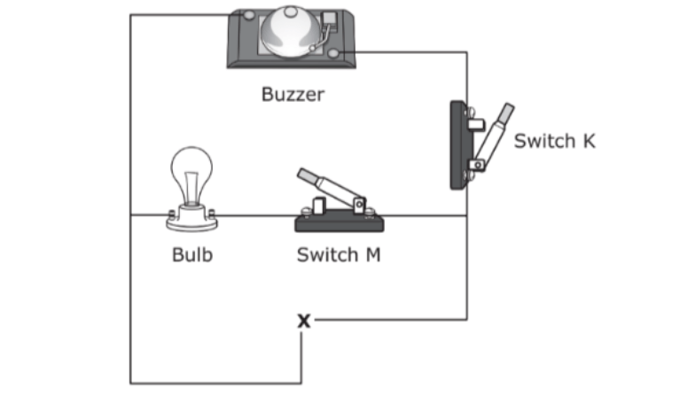 What object can be used at position X for the buzzer to sound when Switch K is closed?
