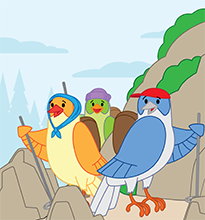 A) Hiking up the mountain trail, birds can be heard chirping cheerfully.
