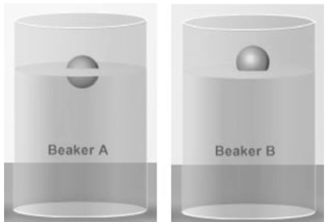 The objects have the same density. The beaker that contains a DENSER liquid.