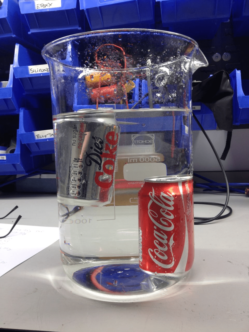 A can of Coke will sink in water. A can of Diet Coke will float in water. Tell me about the can of Diet Coke.