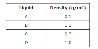 A student pours rubbing alcohol, water, and syrup into a graduated cylinder. The liquids separate into layers with rubbing alcohol on top, water in the middle, and syrup on the bottom.