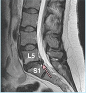 A 43-year-old female patient presents with weakness in her lower extremity and persistent lower back pain that worsens with activity. Her MRI reveals that this anatomical structure, indicated by the arrow, has moved posteriorly to protrude into the vertebral canal.