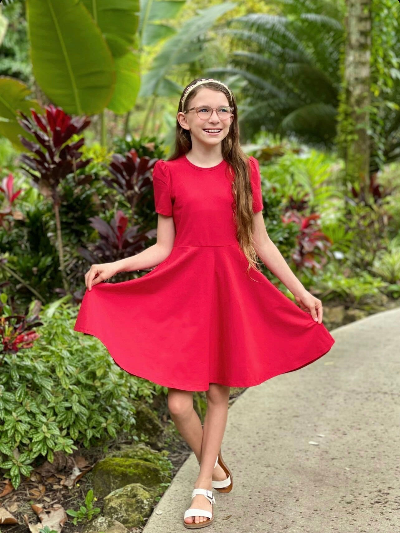 She's wearing a red dress