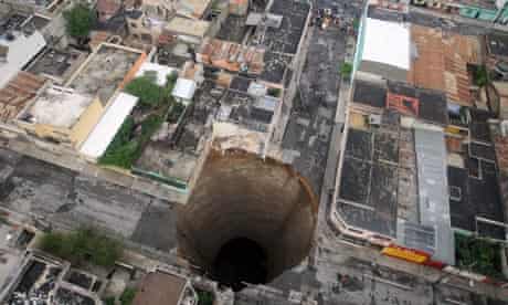 Cavities in the ground that form when water erodes an underlying rock layer.