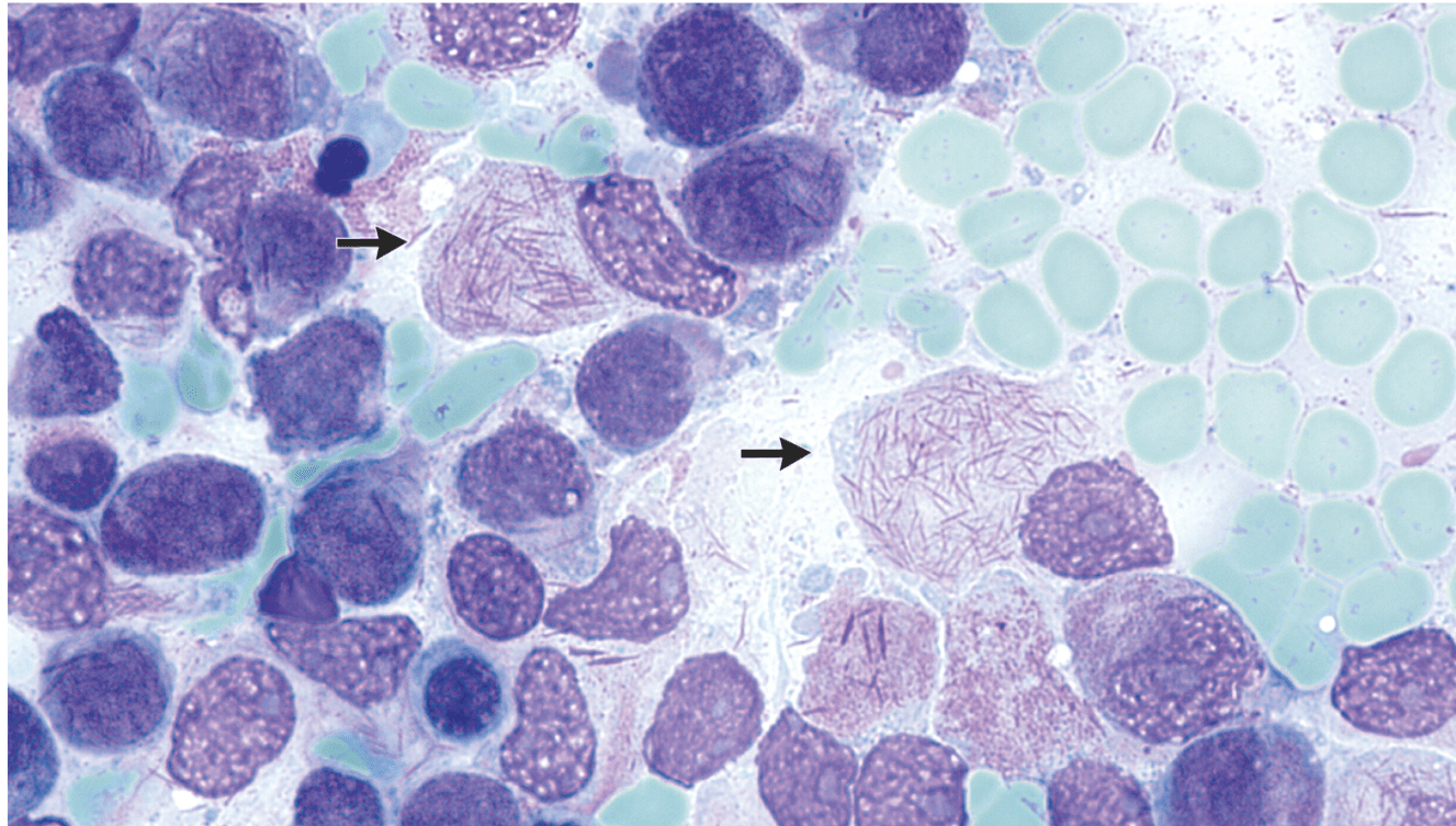 A 47-year-old man presented to the hospital with a 2-day history of weakness and fever. His blood pressure was 64/47 mm Hg, heart rate 110 beats per minute, and temperature 39.0°C. On physical examination, the patient had swelling and redness of the left thigh, which aroused concern about the presence of an abscess. Laboratory studies showed pancytopenia.
