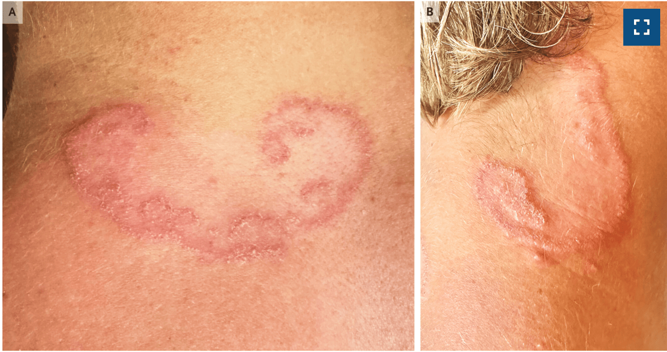 A previously healthy 48-year-old woman presented to the dermatology clinic with a 1-day history of a rash on her right ear that was preceded by 2 days of ear pain and an inability to move the right side of her face