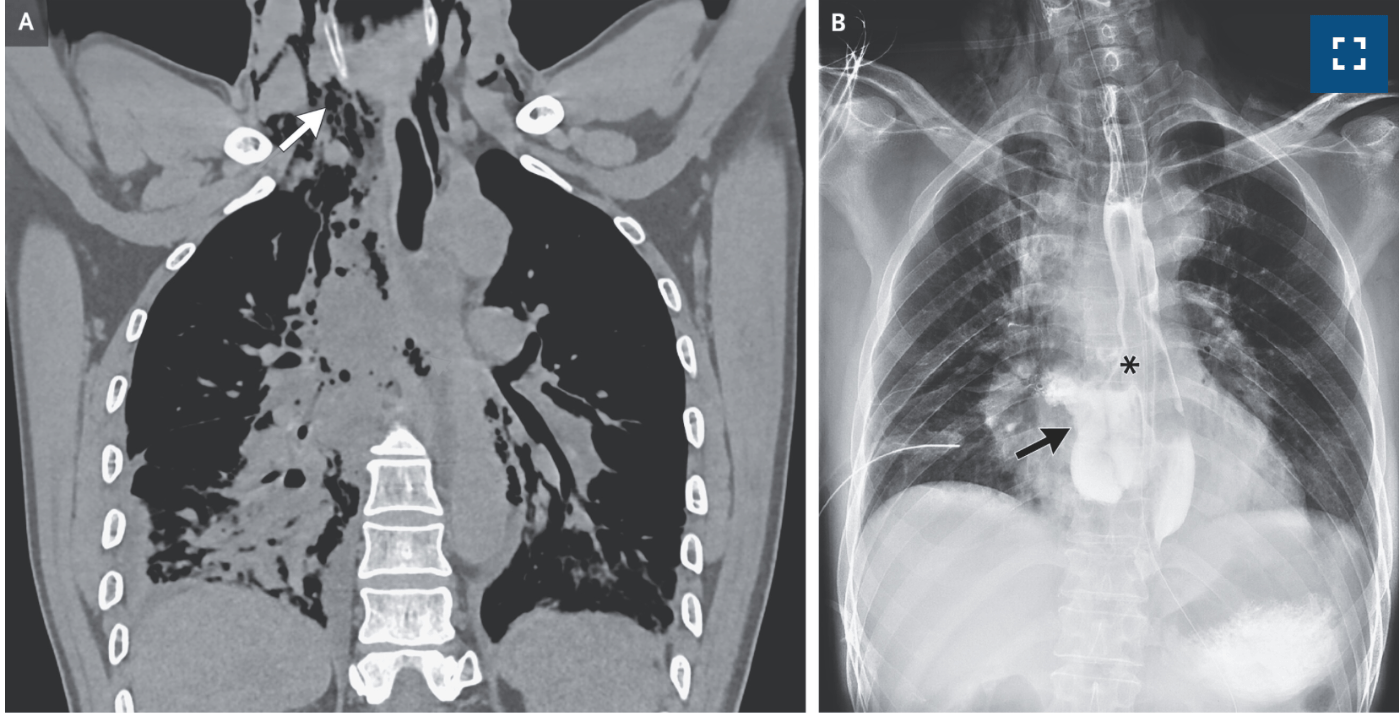 An esophagram that was obtained with the use of water-soluble contrast material confirmed a large laceration of the esophagus (Panel B, asterisk) with extravasation of the contrast material into the mediastinum (Panel B, arrow).