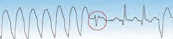 An example of a fusion beat (circled in red), which is a hybrid QRS complex produced by the collision of a ventricular ectopic impulse and a supraventricular (e.g., sinus node) impulse. The presence of fusion beats is evidence of ventricular ectopic activity.