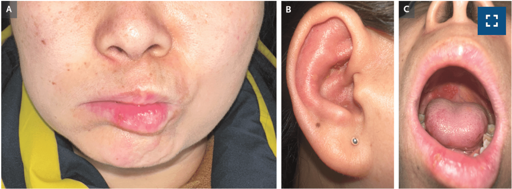 Physical examination shows facial-nerve palsy on the right side (Panel A) and erythema with a few vesicles and some crusting on the pinna of the right ear (Panel B). An oral examination revealed vesicles on the right side of the hard palate, patchy erythema of the anterior tongue, and an ulceration on the right lower lip (Panel C). Consistent with a diagnosis of Ramsay Hunt syndrome
