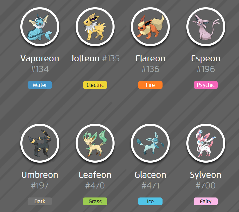 Name all of the evolutions of Eevee: