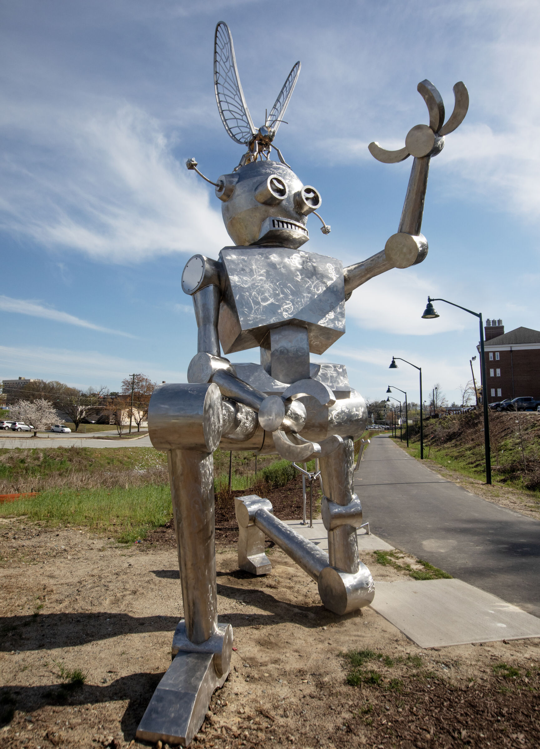 The latest addition to the Downtown Greenway, this installation stands over 19 feet tall and combines a pollinator-themed character with a robotic companion, highlighting Greensboro’s creativity and connection to nature.
