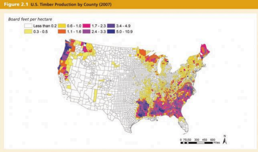 D. Most timber comes from Mississippi, Alabama, Georgia, and Oregon.