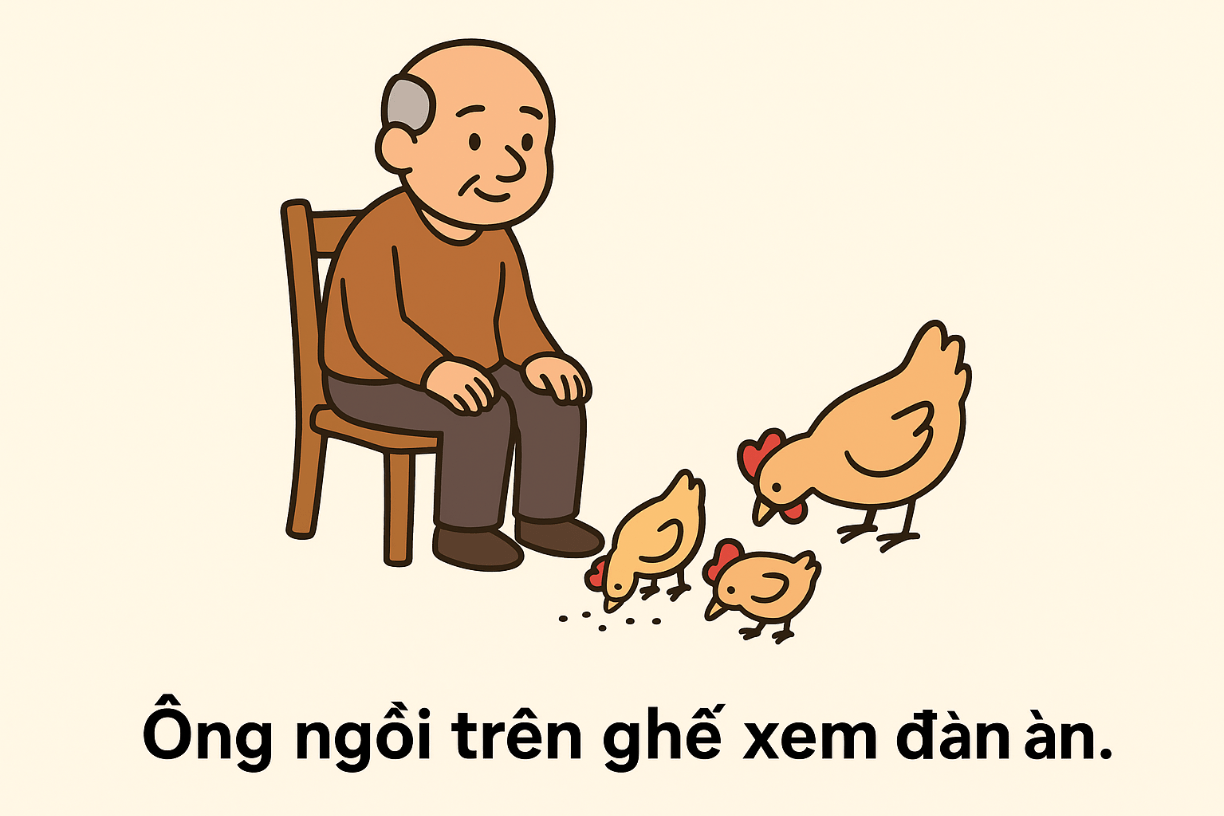 Ông ngồi trên ghế xem đàn gà ăn.
