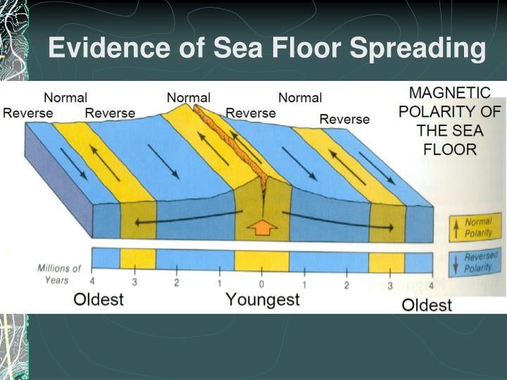 This is one of two pieces of evidence that the seafloor is spreading at a mid-ocean ridge.
