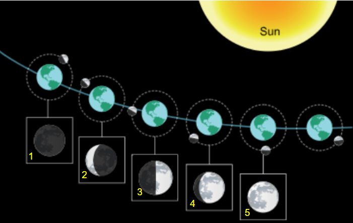 New Moon>Waxing Crescent> 1st Quarter> Waxing Gibbous>Full Moon>Waning Gibbous>3rd Quarter> Waning Crescent
