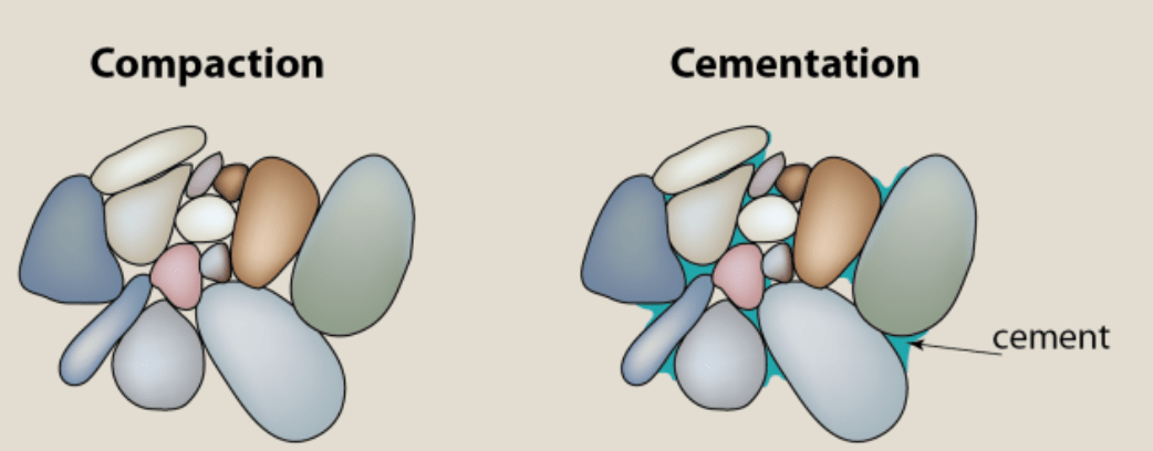 3. sediments are cemented together; minerals fill in the spaces between the loose sediment particles. These cementing minerals come from the water that moves through the sediments