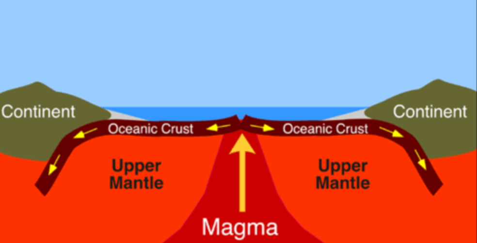 When divergent boundaries pull apart, magma rises from inside the earth, cools and hardens, creating "new" crust