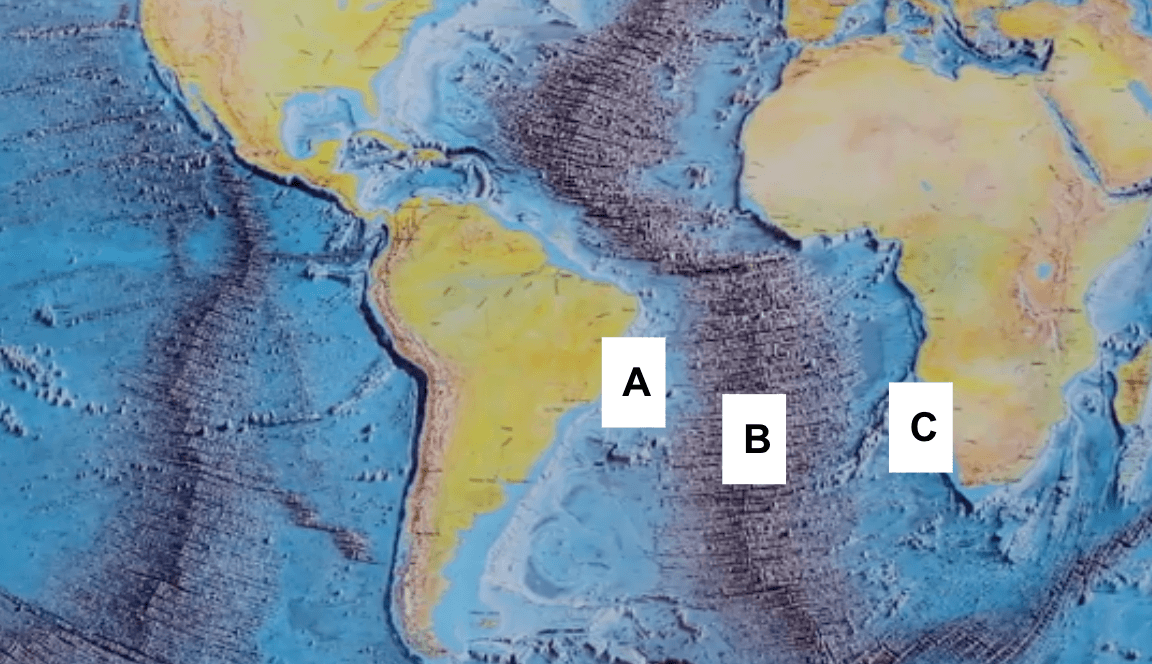 Which letter represents the "youngest" crust at this mid-ocean ridge?