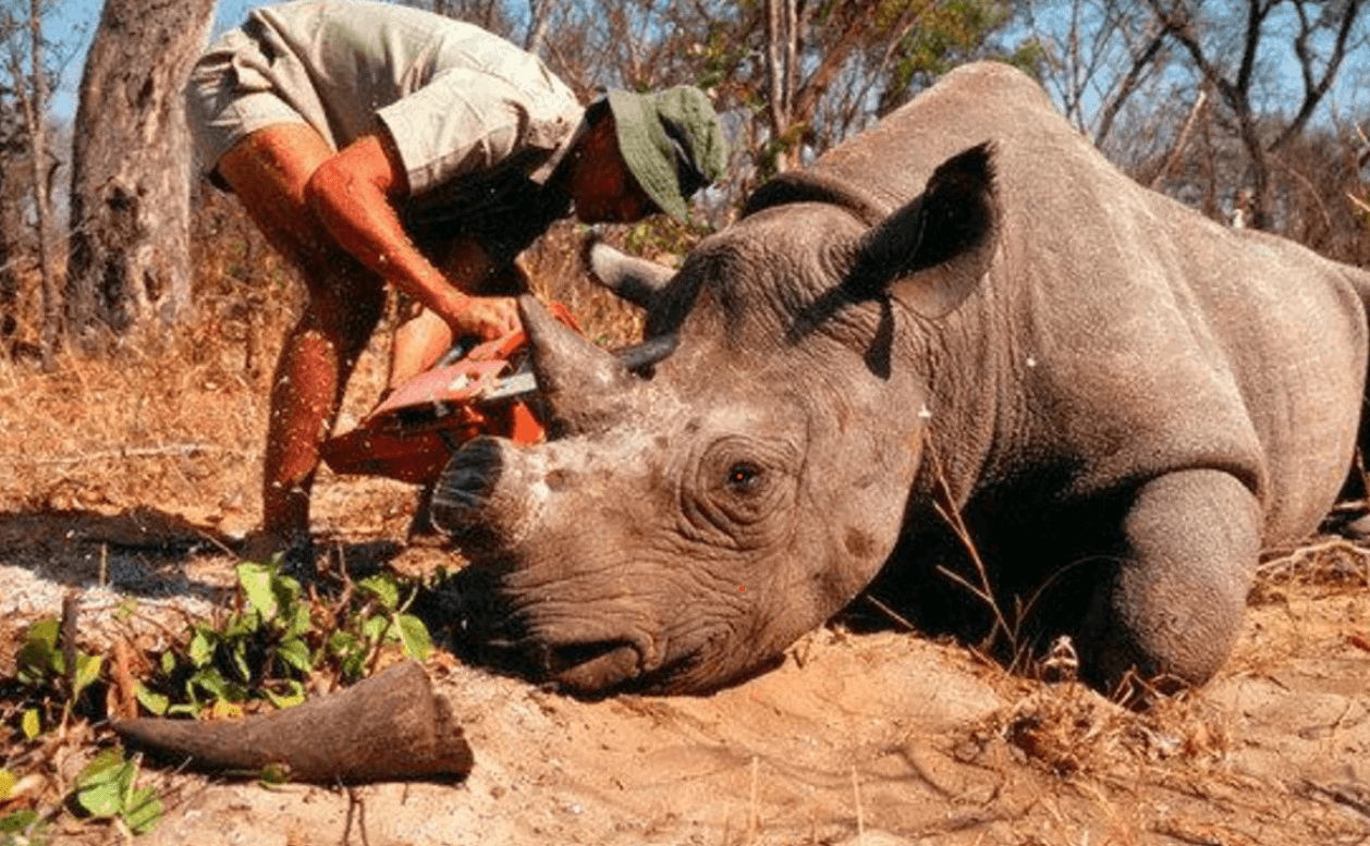 ______ is killing or harvesting protected wild animals to sell their body parts.  This ranger is removing the rhino's horn to keep it from being killed.