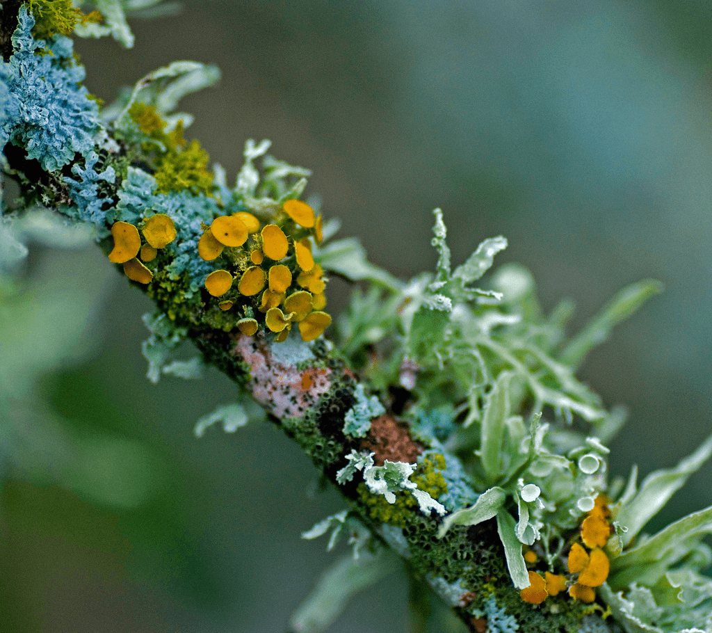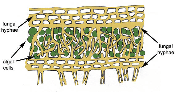 (fungus provides algae a home+ algae does photosynthesis providing glucose for fungus = lichen)