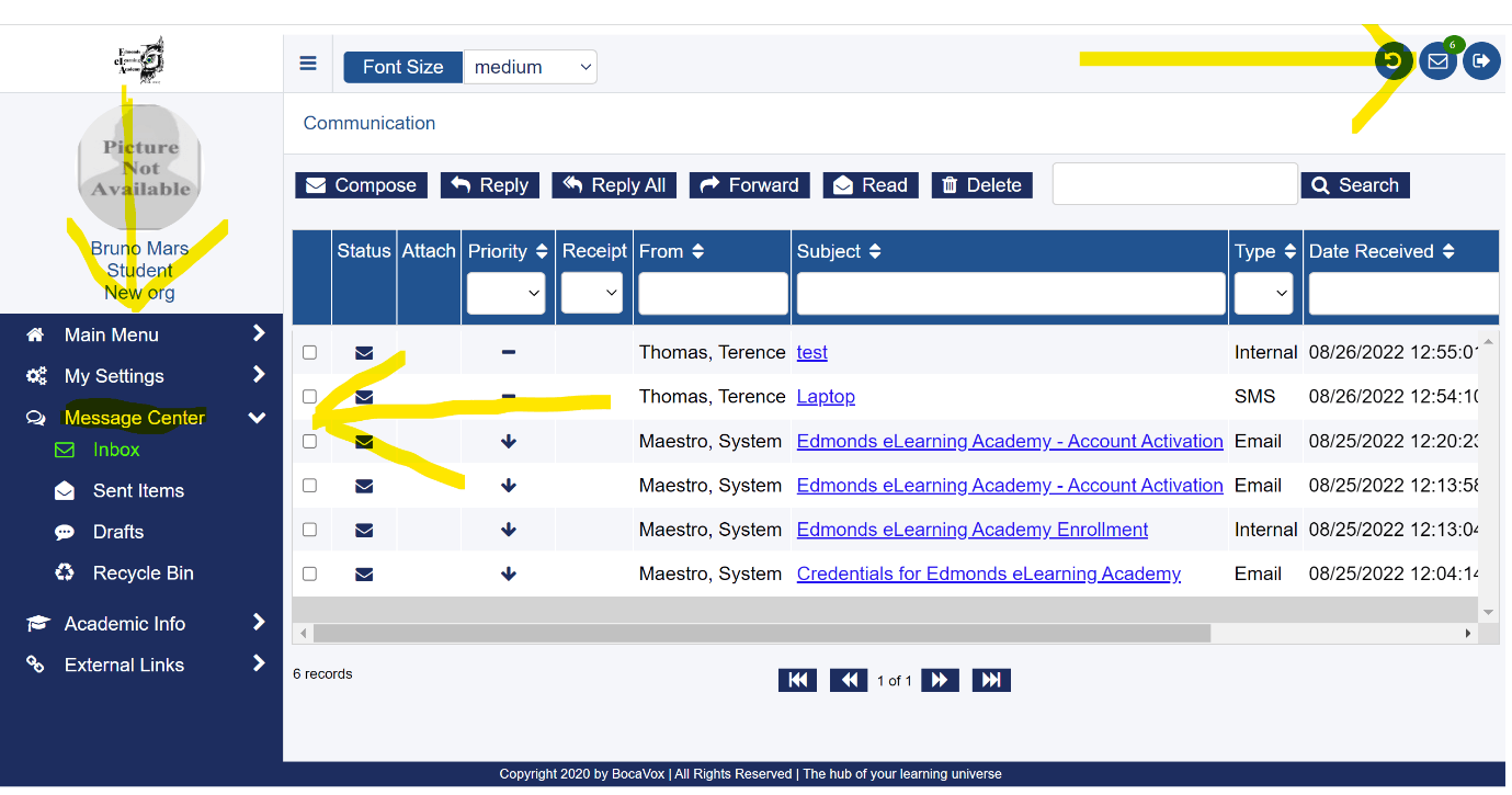 The "Message Center" button on your Dashboard.  You can click on the left, or on the "envelope" icon on the top right: