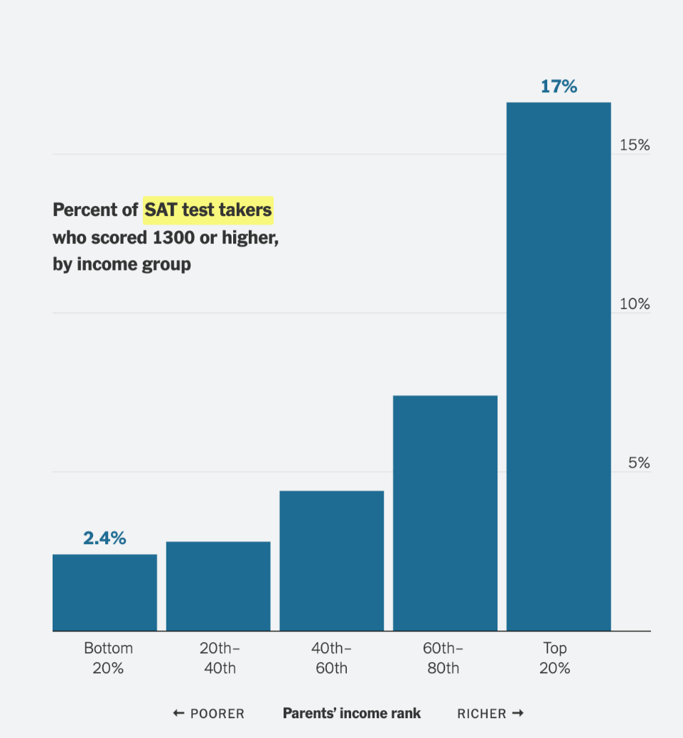 Percent difference of SAT test takers who scored 1300 or higher, by income group between students of families in the bottom 20% income group and the top 20% income group (within 2%).