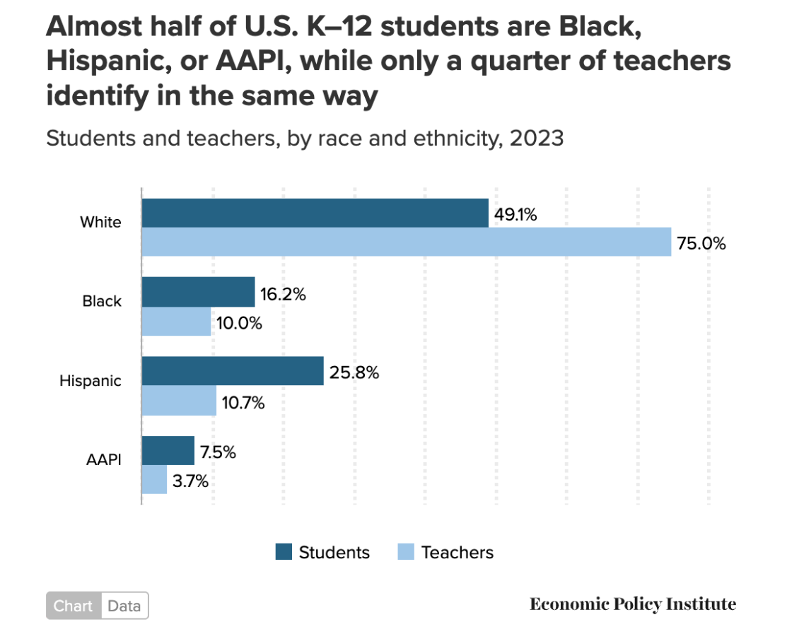 Almost half of US K-12 students are Black, Hispanic, or AAPI compared to ______ % teachers.