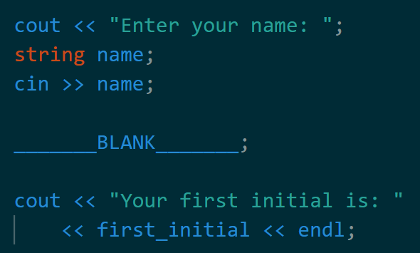 What should go in the blank if we have a function char get_first_initial(string name); that returns the first initial of the name passed in?