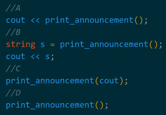 Makayla has a function with declaration void print_announcement(); but she is unsure how to use it to print the announcement. She came up with four options below, which option(s) will work?