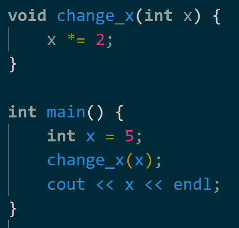 When we pass a variable into a function, it makes a copy of that variable, so the x in the function is a different variable than the x in main(). Therefore, x *= 2 does not modify x in main().