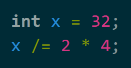 In the +=, -=, etc operators, we first compute the expression on the right side then use that value to modify the variable on the left. Therefore, [x /= 2 * 4] is NOT equivalent to [x = x / 2 * 4], but it is equivalent to [x = x / (2 * 4)]