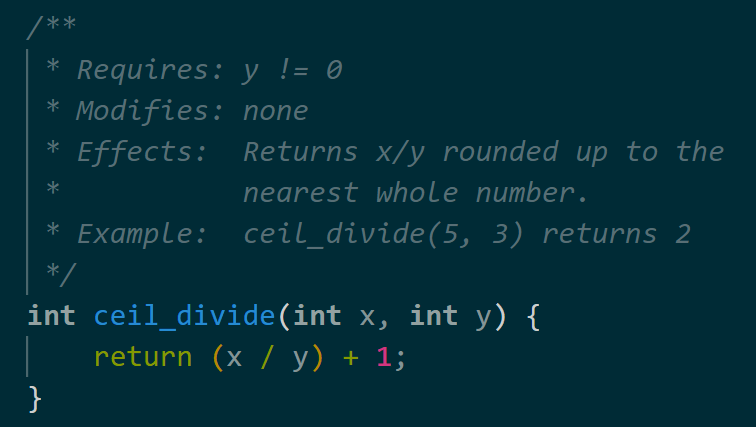 Any x that is a multiple of y would expose the bug. If we specifically pick x = 10 and y = 5 then ceil_divide(x, y) outputs 3, which is not 2 rounded up to the nearest whole number.