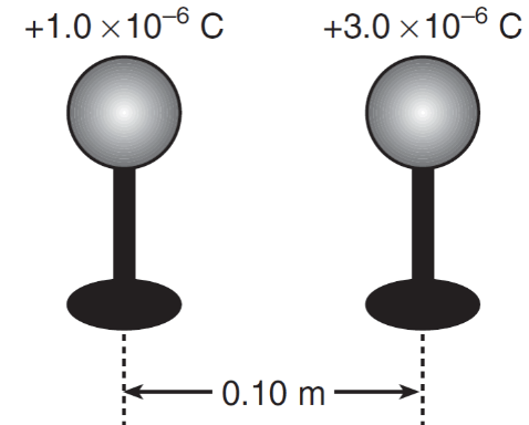 The diagram below shows two metal spheres charged to +1.0 × 10-6 Coulomb and +3.0 × 10-6 Coulomb, respectively, on insulating stands separated by a distance of 0.10 meter.
