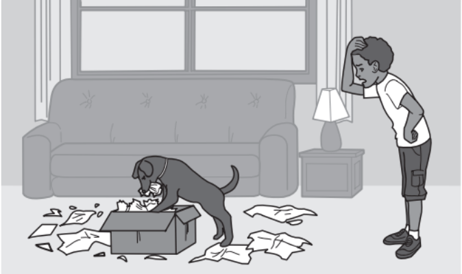 The boy is reacting to the dog making a mess in the cardboard box.