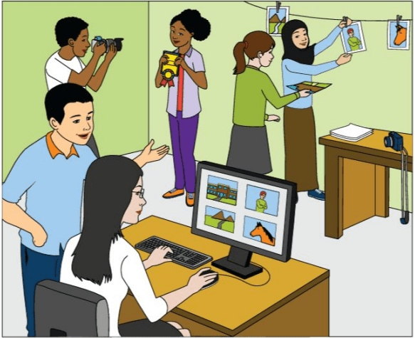 The girl in green is handing a picture over to the girl in blue.