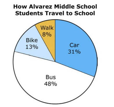 The pie chart shows the percentages of different transportation methods used by the students.