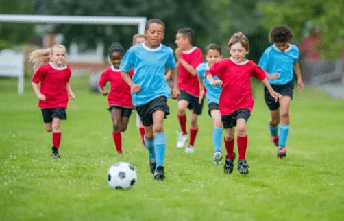 The boy on the blue team is getting closer to the ball.
