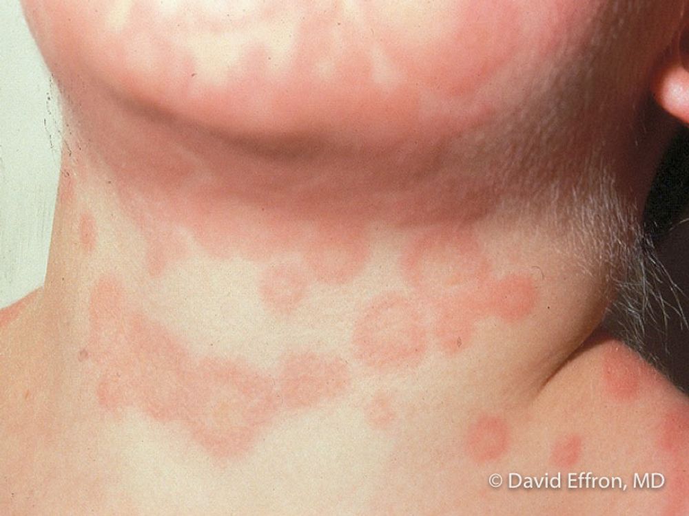 Skin or mouth lesions that have a pink-red center surrounded by a pale ring border and an outer pink-red ring. The lesions can sometimes be painful or itchy.