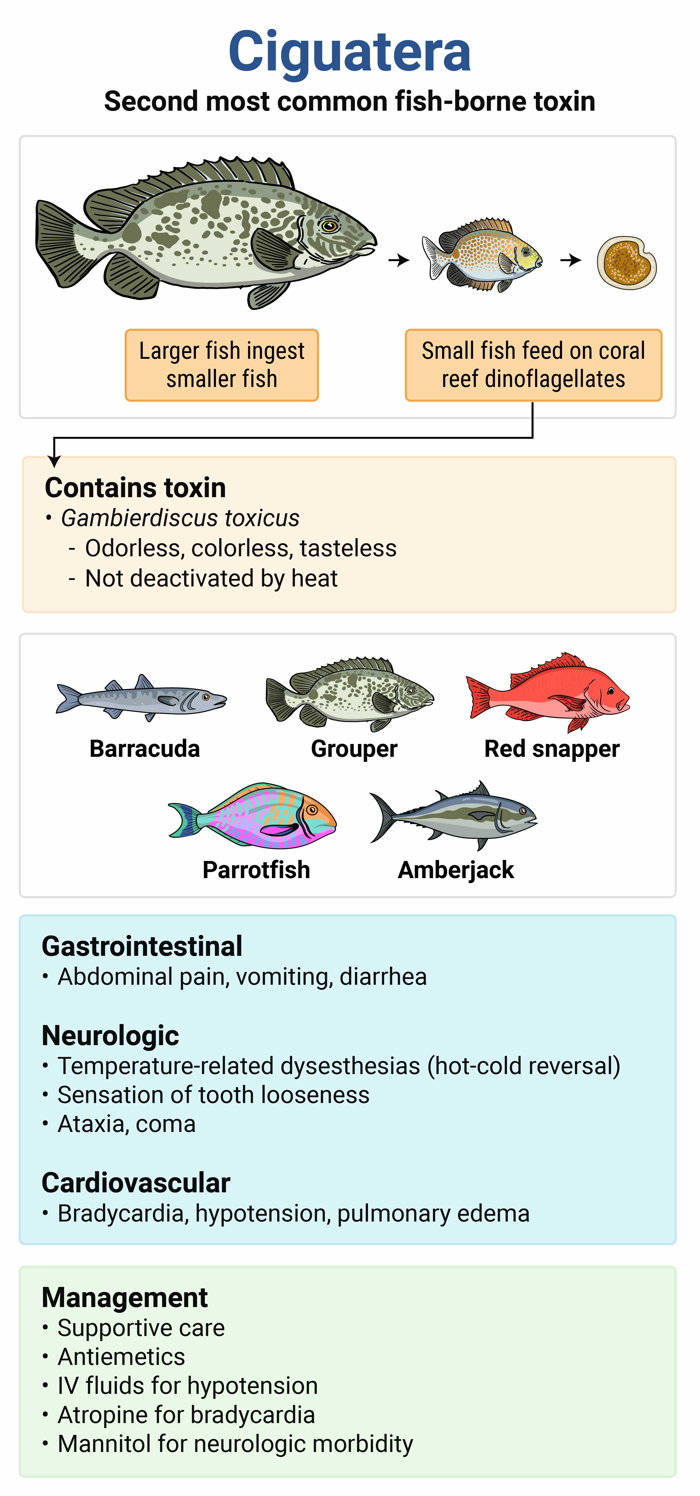 Ciguatera, caused by eating reef fish contaminated by a dinoflagellate, Gambierdiscus toxicus, which produces ciguatera toxin