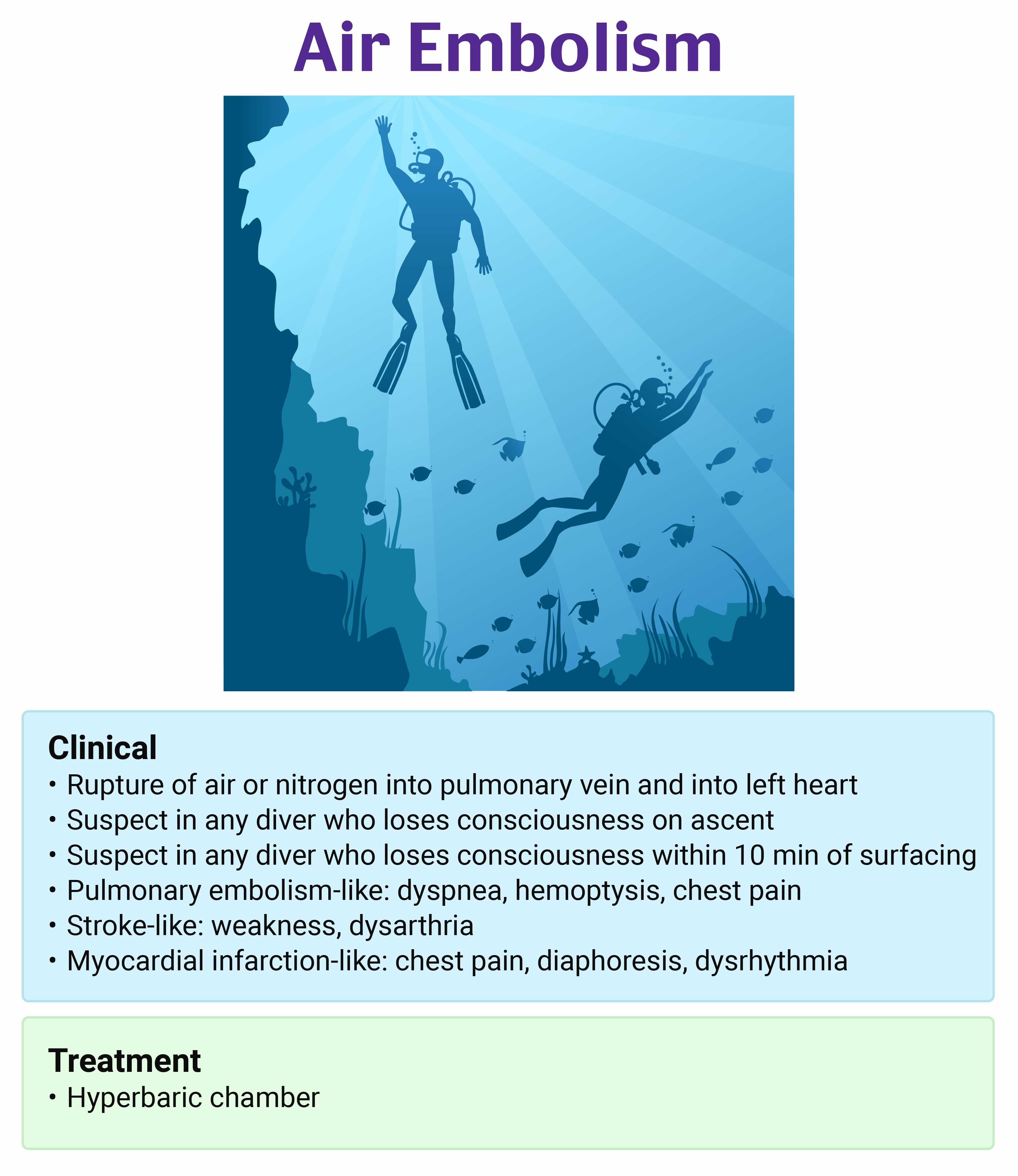 Ascent: Pulmonary barotrauma, arterial gas embolism (AGE), pneumothorax, pneumomediastinum, decompression sickness (DCA I "the bends" joint pain and rash, DCS II "the chokes, the staggers" neuro deficits), middle/inner ear barotrauma
