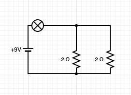 The amount of current that will flow through a circuit connected to a 12V battery with three (3) lightbulbs each with a resistance of 1  Omega   (Must include correct units!)