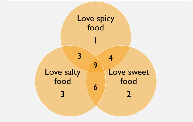 Look at the Venn Diagram about students' food preferences. How many students love both sweet and spicy food, but not salty food?