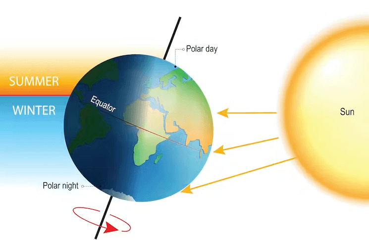The Earth is tilted on its axis which causes different parts of it to receive more direct sunligh than others as it revolves around the sun.