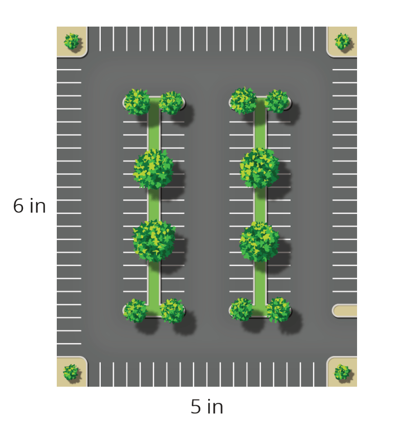 El dibujo a escala de un estacionamiento mide 6 pulgadas de largo y 5 pulgadas de ancho.