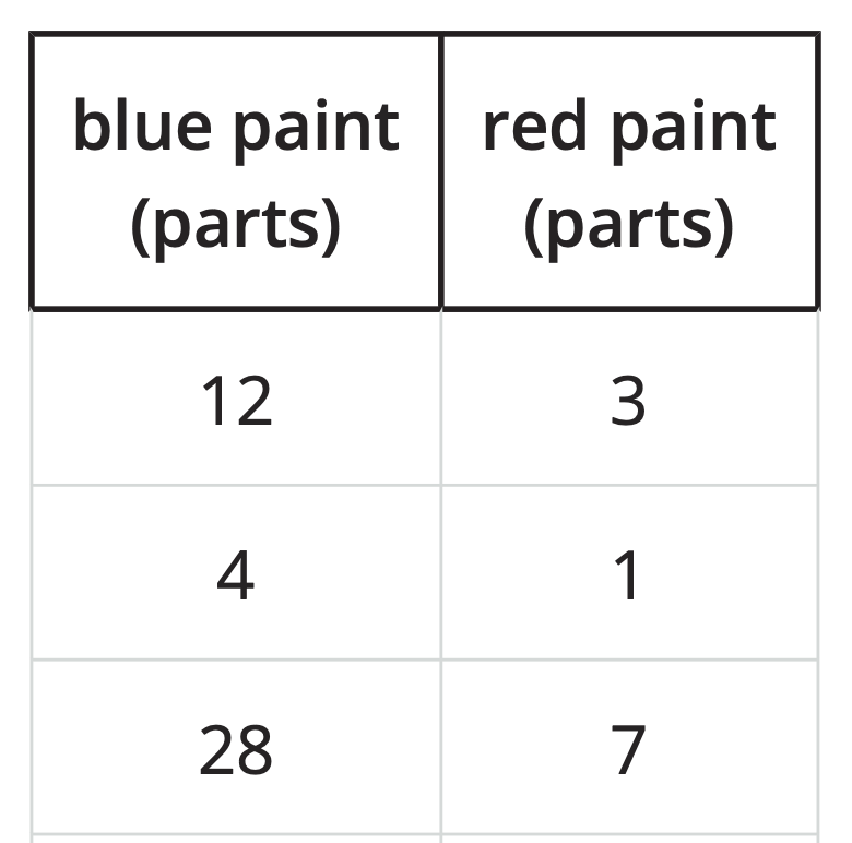 Usando la información de la tabla, ¿cuánta pintura roja necesitarías si tienes 40 partes de pintura azul?