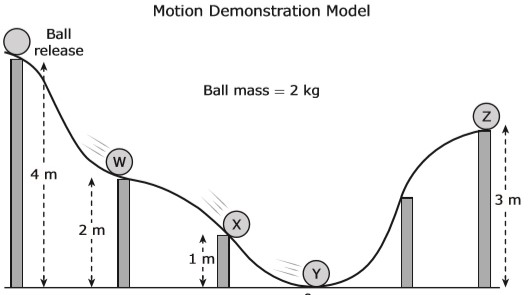 A marble is given potential energy by being placed at Location W. When the marble is released, it rolls down the track.